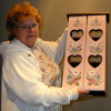 Indy Decorative Painters, Very experienced and creative painters finished two sizeable projects in three days! Most fun for me were all the unusual wood pieces with beautiful and creative adaptations of the designs and different color schemes (see below). Above are a few of the different creations, left to right: Susan's tray, Faye's table, Nancy's cabinet and honorable mention to Sally for her beautiful child's chair (scaled down from the large chair in Book 6, painted earlier). Winnie and her FIVE POUND chocolate bar - the REAL reason painters attend seminars (just kidding)! |