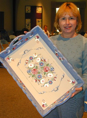 Carolyn's Folk Art Studio, Industrious and fun loving ladies painted for three days and just about finished two projects. The Austrian Tray was fun to paint but I think the favorite was the Bavarian Bouquet Chest! Lin Tillman displays her beautiful color scheme.