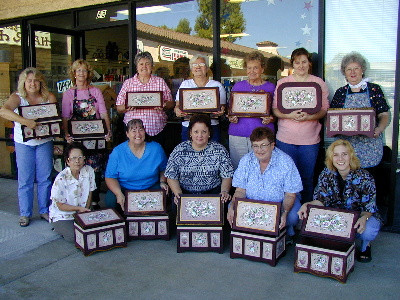 | The Tole Patch Simi Valley, California, October 2003 A wonderful group of ladies painted the Double Scalloped Clock (EVERYONE finished in class!) and the Bavarian Bouquet Chest. Chris and Karen painted a lid, a bowl and a tray instead. Karmen impressed everyone by using a beautiful Delta Background Stencil over the Kleister on her chest. What a great look! We all want to try that technique on a project sometime. Keep up the good work in sunny southern California!