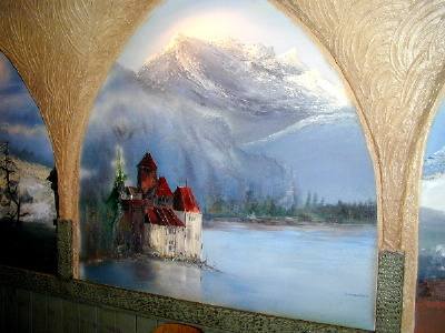 The Painted Touch Beautiful Oregon painters worked on two large pieces for four days and almost finished both! The first two days we painted the Bavarian Bouquet Chest. Renate and Barbara painted large shelves instead. Then we painted the colorful Black Forest Mirror Frame. After that, we were ready to party! Party time at the beautiful German restaurant Rheinländer - a must for everyone visiting the area! Featured are beautiful murals of the Old Country painted on many of the walls and terrific German food! We decided that all future painting parties should be held in the wonderful Alpine Room complete with singing waiter and strolling musician!
